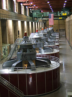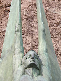 Much of the sculpture at Hoover Dam is the work of Norwegian-born, naturalized American Oskar J.W. Hansen. His most prominent work is a pair of bronze sculptures entitled "Winged Figures of the Republic." The winged figures are 30 feet high. Their shells are 5/8-inch thick, and contain more than 4 tons of statuary bronze. The figures were formed from sand molds weighing 492 tons. They stand on a black, polished base, capped by a 142-foot flagpole. In order to place the blocks of black diorite without marring their highly polished finish, they were centered on blocks of ice, and guided precisely into place as the ice melted. After the blocks were in place, the flagpole was dropped through a hole in the center block into a predrilled hole in the mountain. |