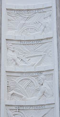 The five bas reliefs on the Nevada elevator tower show the benefits of Hoover Dam: flood control, navigation, irrigation, water storage, and power. The five bas reliefs on the Arizona elevator tower depict "the visages of those Indian tribes who have inhabited mountains and plains from ages distant." |