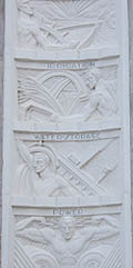 These figures guard the plaque designed by Hansen which commemorates the 96 men who officially died during the construction of Hoover Dam. The plaque which originally was on the Arizona side of the dam, reads: "They died to make the desert bloom. The United States of America will continue to remember that many who toiled here found their final rest while engaged in the building of this dam. The United States of America will continue to remember the services of all who labored to clothe with substance the plans of those who first visioned the building of this dam." |