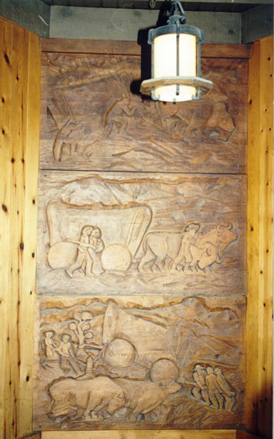 "Pioneers" wood relief By Melvin Keegan, 1936-1937 Located on stairway