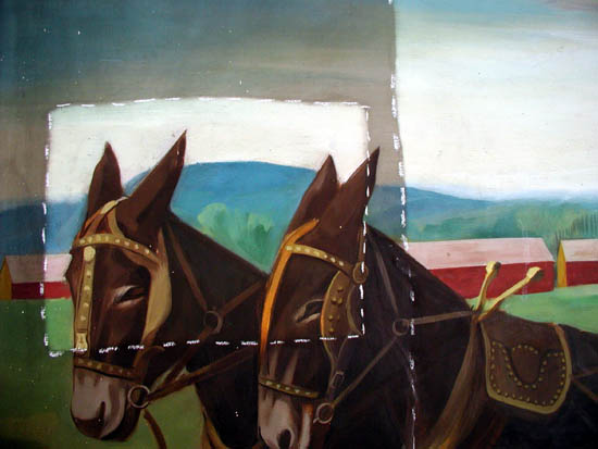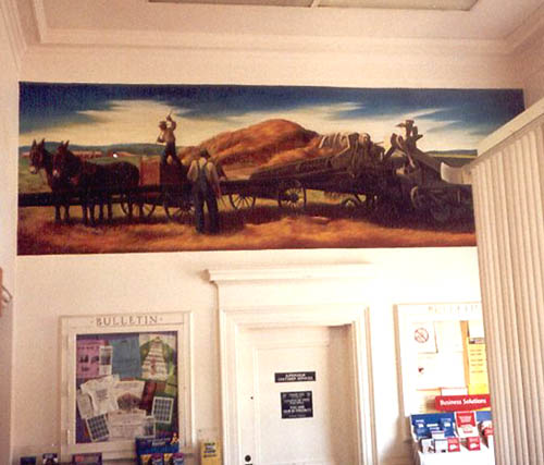 | "Threshing Grain" was painted by Richard H. Jansen in 1938. The mural measures 14' wide by 4'6" high with a total approximate area of 63 square feet. Jansen used the medium oil on canvas, and completed the mural in 232 calendar days. Jansen painted "Threshing Grain" in his studio in Milwaukee, Wisconsin. The mural was later transported on canvas to Lincolnton by train. The subject matter has a local theme. In a handwritten letter dated September 18, 1937, Jansen suggested an agricultural theme "…as I felt I couldn't go wrong, since the town is certainly bound up with the county around it." Though grain was and still is cultivated in Lincoln County, one must speculate the wheat grown in Wisconsin and the Great Plains influenced Jansen's creative process. Jansen received $610 for painting the Lincolnton mural. On June 9, 1938, Postmaster J.F. Seagle announced in the Lincoln County News the mural's placement in the west end of the building and its depiction of a rural Lincoln County scene. |