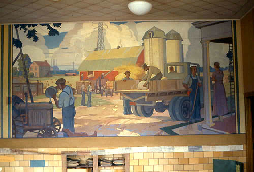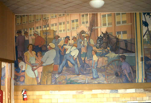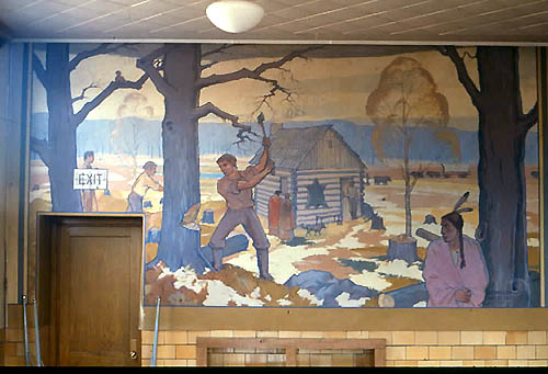 There is a series of murals in the Lincoln Consolidated School, Ypsilanti, done by two brothers, Leon and Bronislau Makielski of Ann Arbor. These photographs were taken a number of years ago in a condemned part of the school building.
