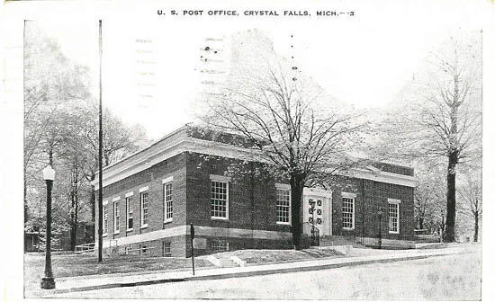 Crystal Falls, MI 49920 Post Office (Iron County), (circa 1940's). Was originally established in Marquette County on September 28, 1881 with Julia Runkel as its first postmaster. Changed to Iron County on April 3, 1885. |