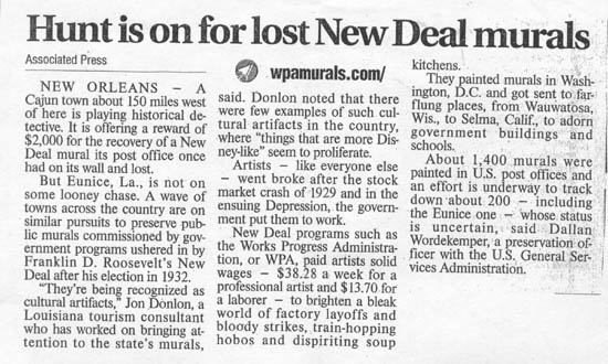 There was a mural installed in the Eunice, LA Post Office entitled "Louisiana Farm" by Laura B. Lewis (1941). Unfortunately through time, it has apparently been removed and lost. The following article from The Oshkosh Northwestern, Oshkosh, WI was contributed by Marian Caron.
