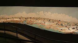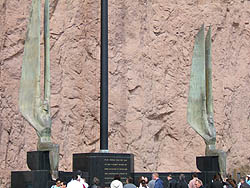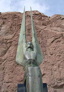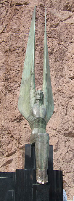 Much of the sculpture at Hoover Dam is the work of Norwegian-born, naturalized American Oskar J.W. Hansen. His most prominent work is a pair of bronze sculptures entitled "Winged Figures of the Republic." The winged figures are 30 feet high. Their shells are 5/8-inch thick, and contain more than 4 tons of statuary bronze. The figures were formed from sand molds weighing 492 tons. They stand on a black, polished base, capped by a 142-foot flagpole. In order to place the blocks of black diorite without marring their highly polished finish, they were centered on blocks of ice, and guided precisely into place as the ice melted. After the blocks were in place, the flagpole was dropped through a hole in the center block into a predrilled hole in the mountain. |