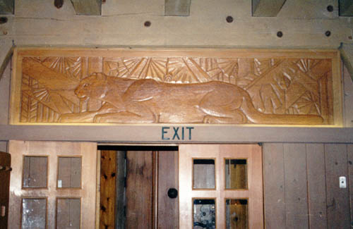 "Cougars Resting in the Forest" By Florence Thomas, wood relief, 1936-1937 Located in Main Lobby