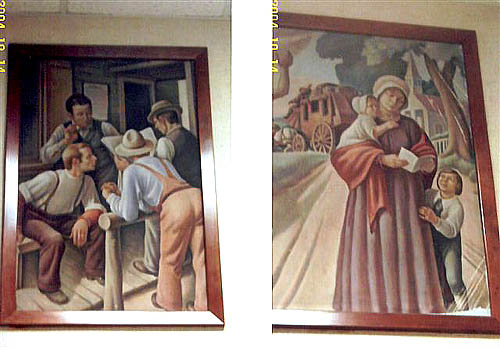 Most of the post office works of art were funded under the Treasury Department's Section commissions. Those works that were created using TRAP funds are so indicated. Although the WPA funded the construction of post office buildings, the artwork was not WPA but was usually produced under the Section or TRAP programs. Unless indicated, works of art are located in the US Post Office building.